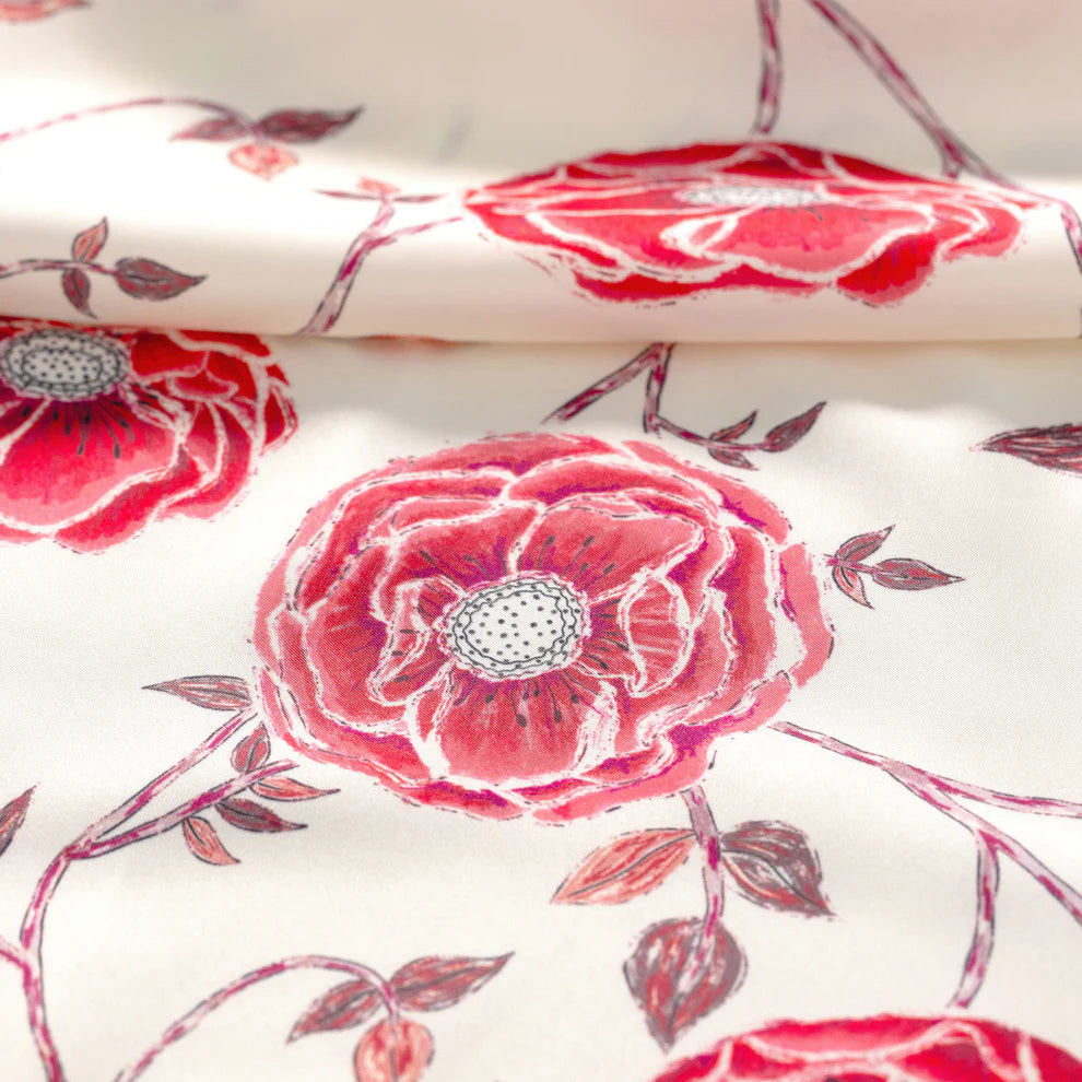 Bold yet romantic, the Cherry scarf features vivid red blooms and delicate vines on a soft ivory backdrop, framed with a striking crimson border. Crafted from 100% vegan silk (rayon) and finished with hand-rolled edges, this 90x90 cm piece adds a vibrant flourish to any ensemble. Gentle hand wash or dry clean recommended.